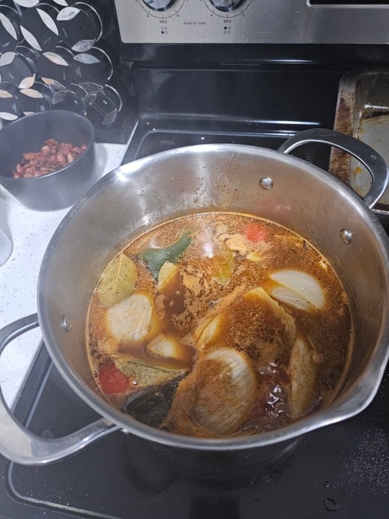 Take your meat out at least 2 hours before you start cooking. You’ll also want to start rehydrating your chilè arbol 15 minutes ahead of time in warm water. Start off by giving your veggies a light coating of oil (please peel your onion first) and throw them in the oven for 15 minutes at 350° F. While they’re having a quick bake, cover all sides of your meat with black pepper. In a large stock pot or Dutch oven, pour just enough oil to cover the bottom. Brown your meat over medium-high heat until you have a good crust on all sides. Place those aside, and let’s build that consumè.